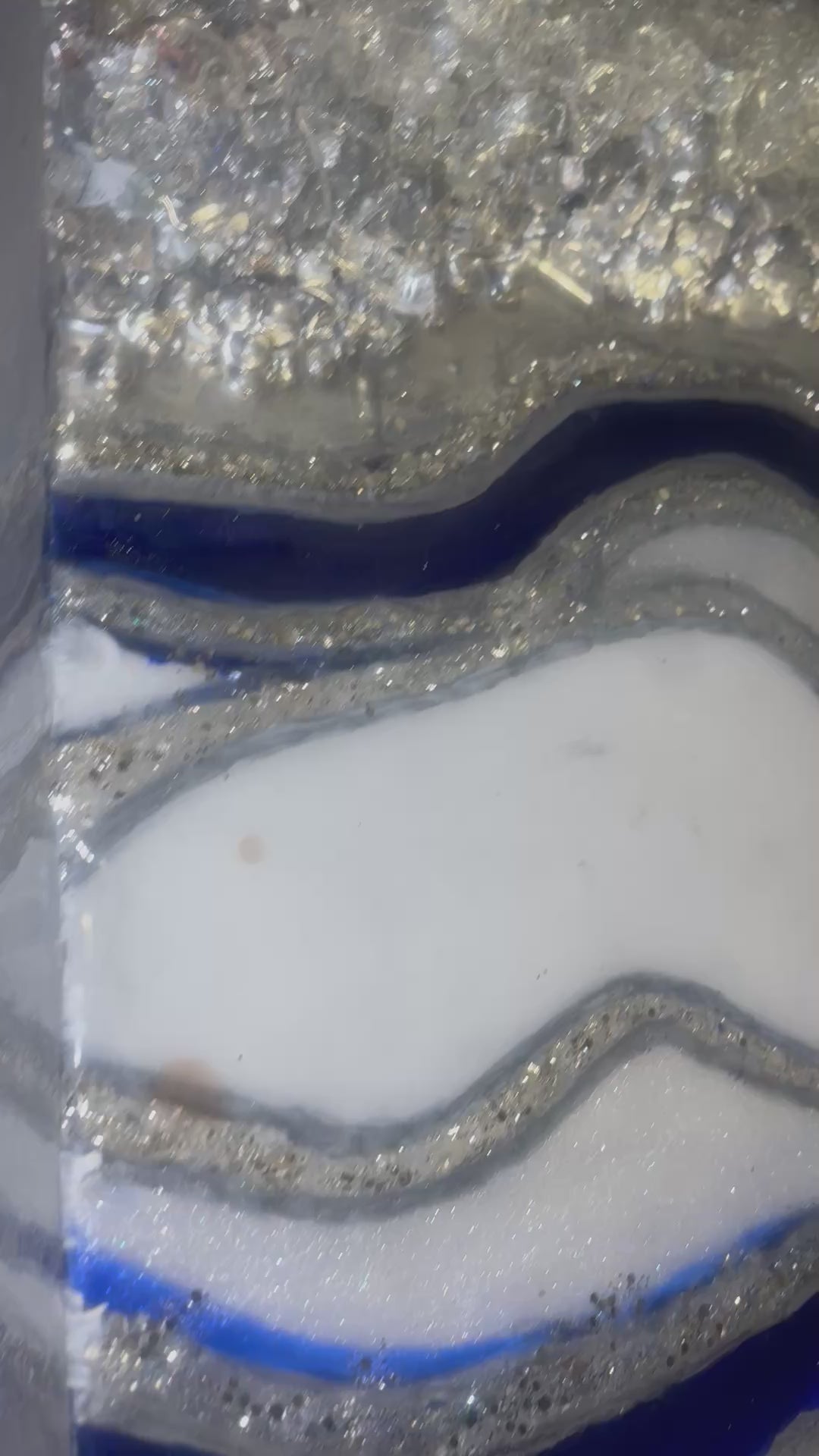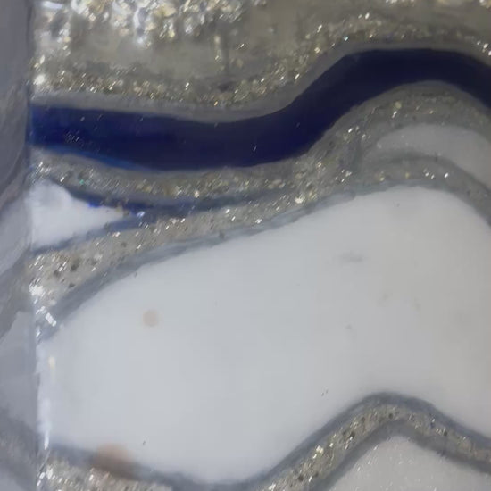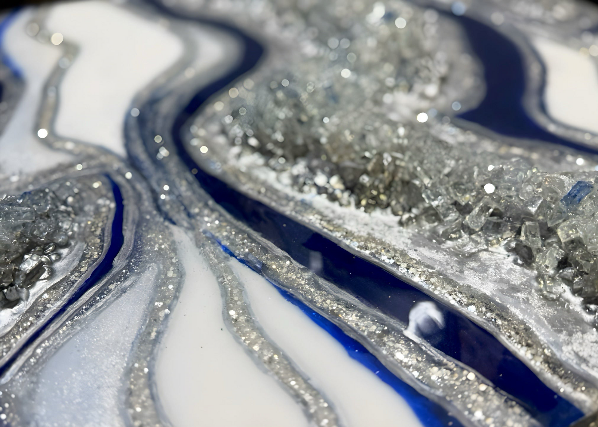 Immerse your space in the tranquil beauty of the deep with this hand-painted, epoxy resin wall painting, inspired by a deep sea blue geode. Rich, highly-pigmented blues—accented by veins of shimmering silver and crystalline white, this hand-crafted resin painting captures the mesmerizing fusion of a deep sea palette with the raw elegance of a natural geode. frozen in time by a lustrous epoxy finish. More than just art, it's a unique, three-dimensional statement piece that evokes the calm mystery of deep water and the radiant energy of the earth's core.